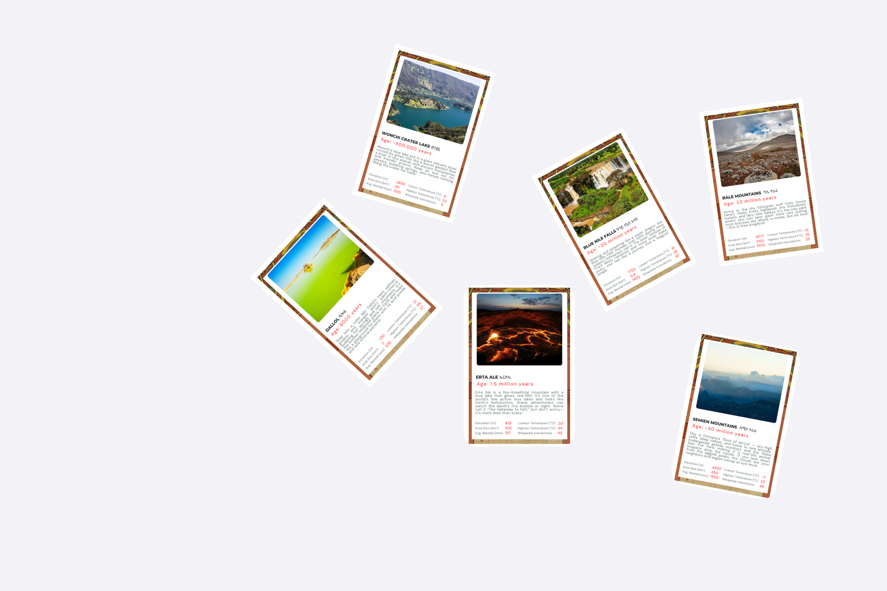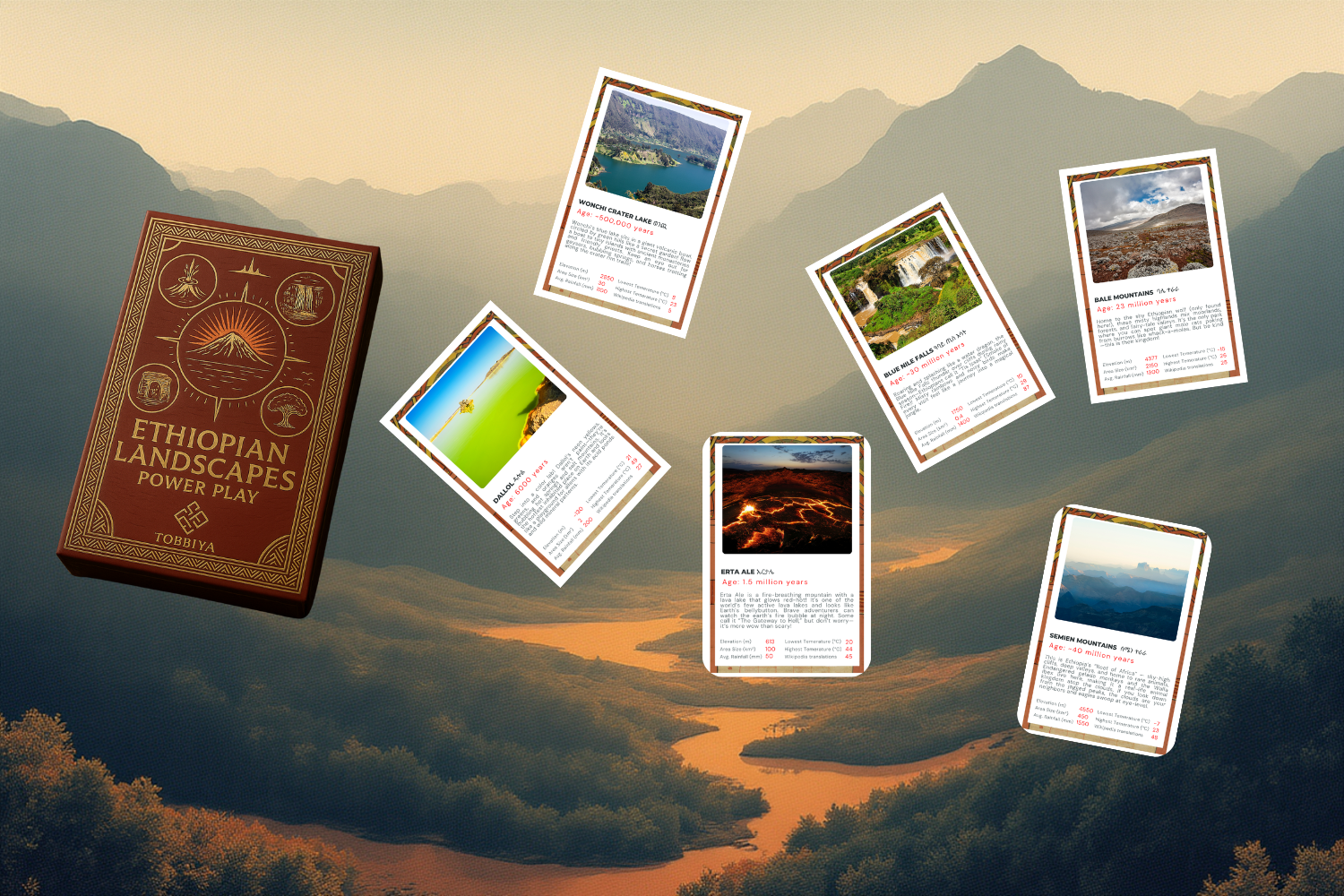• 32 cards featuring Ethiopia’s most stunning deserts, lakes, mountains, and valleys